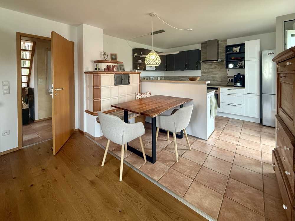 Der großzügige Wohn-Essbereich im Obergeschoss ist das Herzstück der Wohnung. Ein eleganter Kachelofen sorgt für wohlige Wärme und schafft eine behagliche Atmosphäre an kalten Tagen. Große Fensterfronten lassen viel Tageslicht herein und öffnen sich zum verglasten Süd-Balkon – hier können Sie sonnige Stunden genießen, den Blick ins Grüne schweifen lassen oder entspannte Abende verbringen.