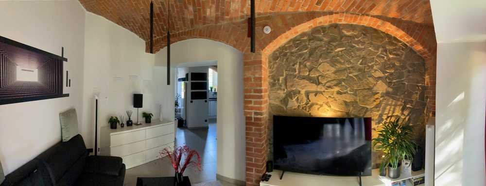 Im Erdgeschoss erwartet Sie eine stilvolle, moderne Einbauküche, die für kulinarische Erlebnisse und gesellige Kochabende bestens ausgestattet ist. Angrenzend finden Sie ein einladendes Wohnzimmer mit Zugang zur sonnigen Terrasse, perfekt für entspannte Stunden im Freien. Die Natursteinwände und Gewölbedecken verleihen dem Raum eine besondere Atmosphäre und unterstreichen den einzigartigen Charakter des Hauses. Ein praktisches Gäste-WC rundet das Erdgeschoss ab.