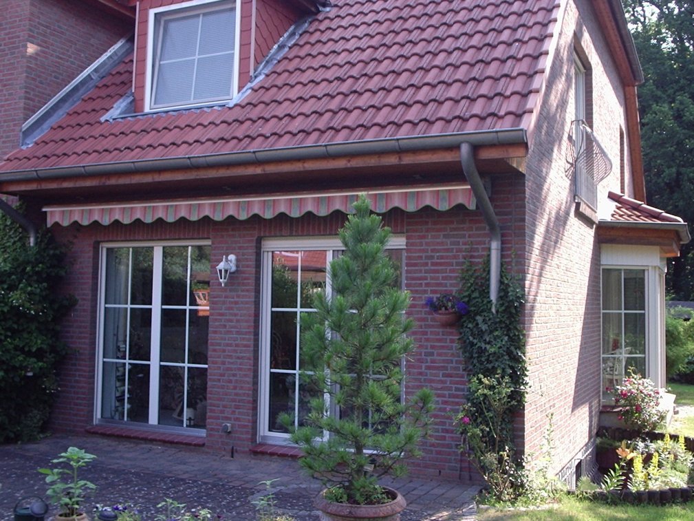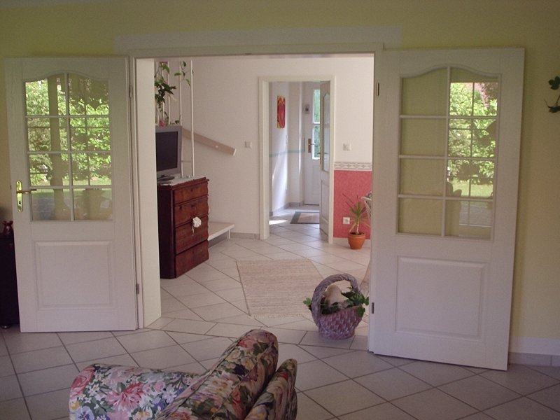 - Wohnzimmer mit doppelflügeliger Tür zum Essbereich und Terrasse mit Markise