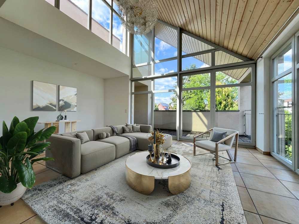 Die Wohnung im Obergeschoss überzeugt mit einem lichtdurchfluteten Wohn-/Essbereich und Zugang zum ca. 11 m² großen Balkon mit Blick ins Grüne. Die offene Küche ist mit hochwertigen Geräten ausgestattet, eine Speisekammer bietet zusätzlichen Stauraum.