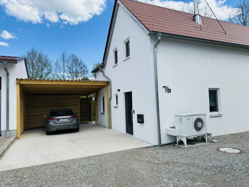 Ein überdachter Carport mit Abstellraum sowie ein zusätzlicher Außenstellplatz sorgen für bequemes Parken. Die sonnige Südterrasse unterstreicht den durchdachten Charakter der Immobilie.