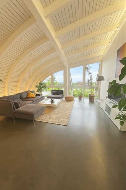 Die besondere Formensprache, gewölbte Decken mit offenen Rundbalken und ein durchdachtes Lichtkonzept verleihen dem Objekt eine unverwechselbare Identität.