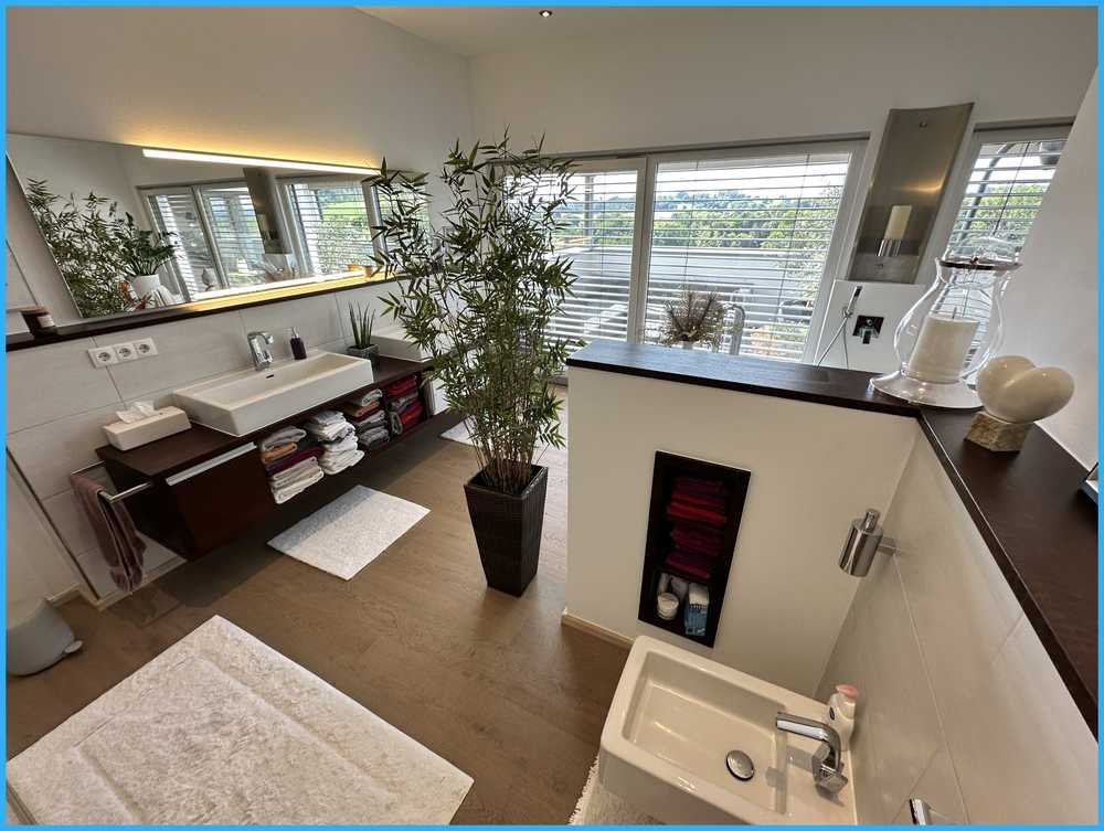 Das Haus besticht durch seine elegante Architektur und die hochwertige Ausstattung. Auf insgesamt 5 Zimmern, darunter 3 Schlafzimmer, finden Sie und Ihre Lieben Raum zur Entfaltung und Rückzugsmöglichkeiten. Die zwei stilvollen Badezimmer sind perfekt ausgerichtet für einen angenehmen Start in den Tag. Eines davon ist eine Wellness-Oase für höchste Ansprüche, direkt im Schlafzimmer integriert.