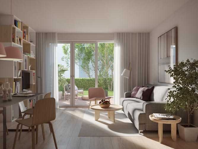 Die stilvolle Architektur mit klaren Fassaden und markanten Putzstrukturen interpretiert ländliches Wohnen neu und schafft durch versetzte Fassadenbereiche individuelle Rückzugsmöglichkeiten. Ein begrünter öffentlicher Platz und ein Kinderspielplatz fördern die Nachbarschaftsgemeinschaft, während die autofreie Gestaltung des Quartiers für Ruhe und Sicherheit sorgt. Die Tiefgarage bietet ausreichend Parkmöglichkeiten und ist mit einem Lademanagementsystem sowie optionaler Wallbox ausgestattet.