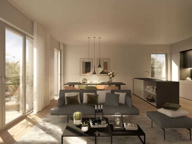 Die stilvolle Architektur mit klaren Fassaden und markanten Putzstrukturen interpretiert ländliches Wohnen neu und schafft durch versetzte Fassadenbereiche individuelle Rückzugsmöglichkeiten. Ein begrünter öffentlicher Platz und ein Kinderspielplatz fördern die Nachbarschaftsgemeinschaft, während die autofreie Gestaltung des Quartiers für Ruhe und Sicherheit sorgt. Die Tiefgarage bietet ausreichend Parkmöglichkeiten und ist mit einem Lademanagementsystem sowie optionaler Wallbox ausgestattet.