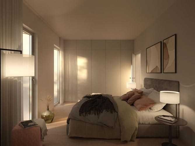 Die stilvolle Architektur mit klaren Fassaden und markanten Putzstrukturen interpretiert ländliches Wohnen neu und schafft durch versetzte Fassadenbereiche individuelle Rückzugsmöglichkeiten. Ein begrünter öffentlicher Platz und ein Kinderspielplatz fördern die Nachbarschaftsgemeinschaft, während die autofreie Gestaltung des Quartiers für Ruhe und Sicherheit sorgt. Die Tiefgarage bietet ausreichend Parkmöglichkeiten und ist mit einem Lademanagementsystem sowie optionaler Wallbox ausgestattet.