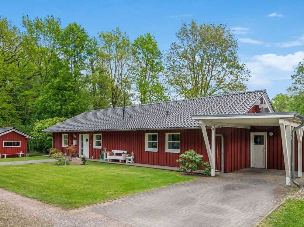 Das Einfamilienhaus ist von einem Architekten geplantes und entworfenes Schwedenhaus in Massivbauweise mit einer aufwendigen Deckelschalung aus Lerche als Außenhaut versehen. Gestrichen ist das Haus mit der traditionellen Schwedenfarbe „Falu-Röd“.