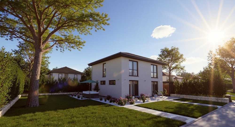Die beispielhafte Bebauung sieht eine energieeffiziente Stadtvilla mit flexibler Raumgestaltung vor, die sich ideal an unterschiedliche Lebensmodelle anpassen lässt.
