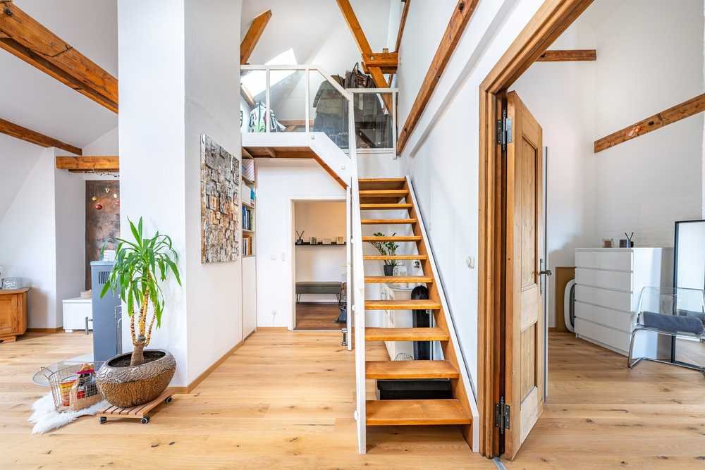 Über eine stilvolle Innentreppe im Wohnbereich gelangen Sie zur Galerie, die derzeit als begehbare Ankleide genutzt wird.
