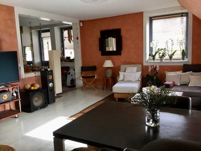 Sie befindet sich im 1. Obergeschoss und Dachgeschoss eines gepflegten Mehrfamilienhauses mit 6 Wohneinheiten. Die Wohnung verfügt über einen eigenen Eingang. Ursprünglich als zwei Wohneinheiten geplant, wurden die Wohnungen nachträglich miteinander verbunden und umgebaut. Aufgrund der offenen Raumgestaltung verfügt die Eigentumswohnung derzeit über drei Zimmer, die sich auf ungefähr 155 m² Wohnfläche aufteilen und mit wenigen Umbauarbeiten zu 4 bis 5 Zimmer neu aufgeteilt werden kann. Somit bietet die Eigentumswohnung dem zukünftigen Käufer eine flexible Gestaltungsmöglichkeit. Die Maisonettewohnung schafft eine offene, einladende Atmosphäre und verleiht der Wohnung ihren besonderen Charakter im Loft-Charme. Die Wohnung verfügt über 2 Bäder, einen offenen Wohn-/Kochbereich, sowie wunderbare Schlafmöglichkeiten im Dachgeschoß. Auch die Integrierung eines Arbeits- oder Gästezimmers ist mühelos möglich. Der großzügige überdachte Balkon lädt zum Verweilen ein und bietet eine Fläche von insgesamt ca. 11 m².