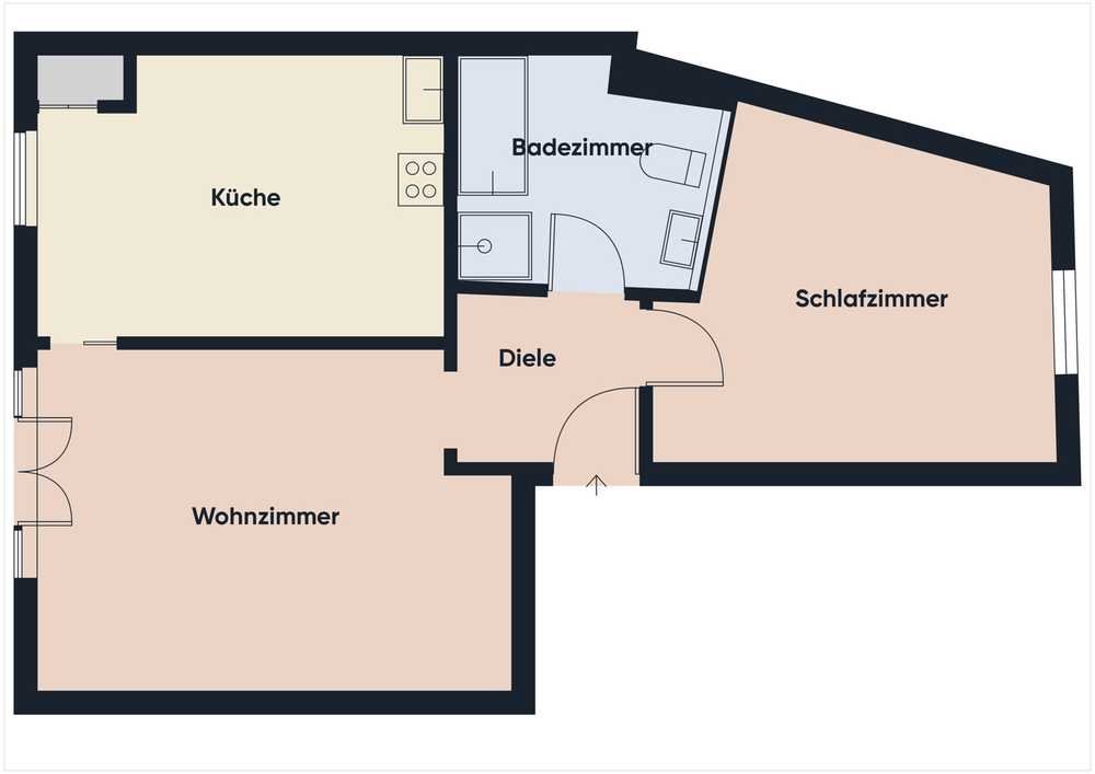 Die funktionale Raumaufteilung schafft klare Strukturen und eine angenehme Wohnatmosphäre. Die geräumige Diele führt in alle Bereiche der Wohnung: Schlafzimmer, das Badezimmer mit Badewanne sowie den Wohnbereich mit angrenzender Wohnküche und Zugang zur Terrasse. Diese Wohnung eignet sich ideal für alle, die stilvoll wohnen möchten – ohne auf Gemütlichkeit zu verzichten.