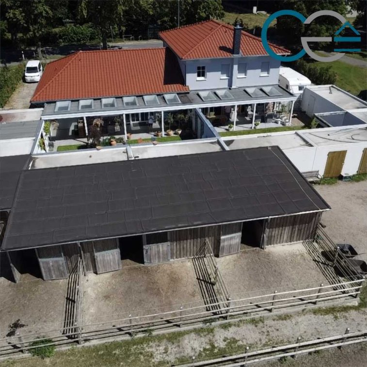 Auch die gemeinsame Nutzung als großes Familienanwesen ist möglich – mit großzügiger Wohnfläche, vielseitiger Gartennutzung und eigenem Reitbereich direkt am Haus.