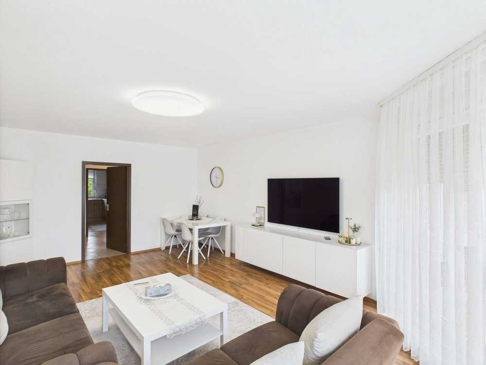 Das Herzstück der Wohnung bildet das einladende Wohnzimmer mit direktem Zugang zur sonnigen Terrasse – einer von gleich zwei Außenbereichen, die zum Entspannen und Verweilen einladen. Ob Frühstück im Grünen oder laue Sommerabende mit Freunden – hier genießen Sie Ihr eigenes Stück Natur inmitten des urbanen Rhein-Main-Gebiets.