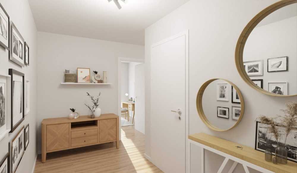 Der großzügige Flur führt Sie direkt in das Herzstück der Wohnung: den offenen Wohn- und Essbereich. Hier können Sie gemütliche Abende verbringen und Ihre Gäste bewirten. Die angrenzende Küche ist modern und funktional gestaltet. Vom Wohnbereich gelangen Sie auf den großen Balkon, der nach Osten ausgerichtet ist, perfekt für entspannte Morgenstunden. Das Schlafzimmer bietet ausreichend Platz für Ihre Ruhezone und Zugang zu einer Loggia. Ein weiteres Zimmer eignet sich ideal als Kinderzimmer oder Homeoffice. Zwei stilvolle Badezimmer sorgen für zusätzlichen Komfort. Ein praktischer Abstellraum rundet das Raumangebot ab.