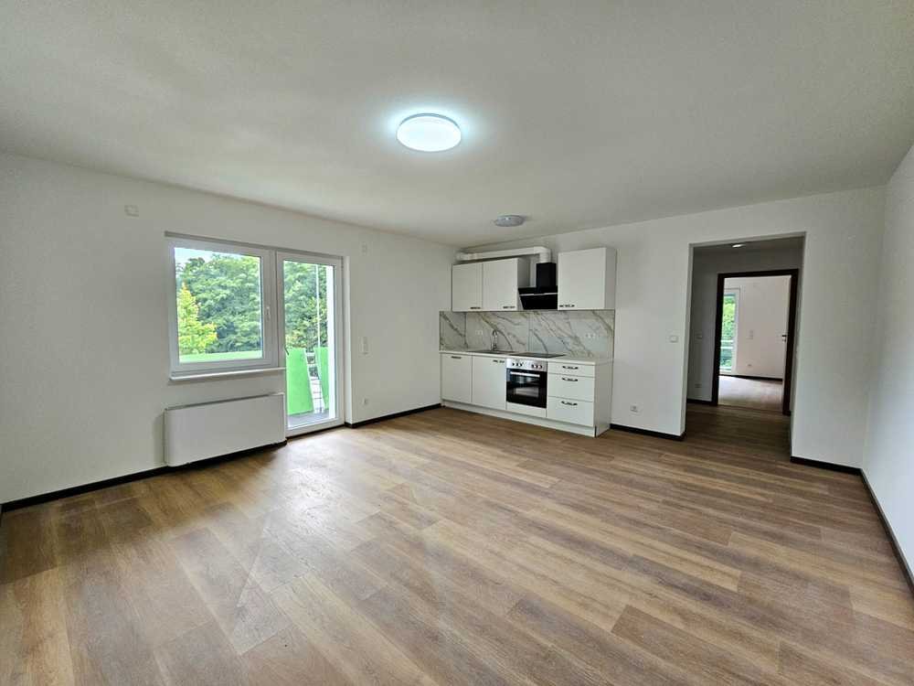 Der helle Wohnbereich und das Schlafzimmer bieten den direkten Zugang zum großzügigen Balkon. Dieser verläuft über zwei Seiten der Wohnung - perfekt zum Entspannen mit Blick ins Grüne. Die moderne Einbauküche ist bereits vollständig integriert und fügt sich perfekt in das offene Wohnkonzept ein.