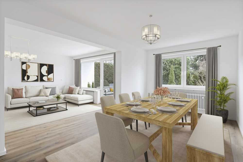 Wohn-/Essbereich - ein lichtdurchfluteter Wohnraum mit einem angenehmen Wohngefühl und Zugang zur sonnigen Süd-Terrasse für gesellige Grillabende mit Freunden und in den Garten, in dem sich Ihre Kinder austoben können.