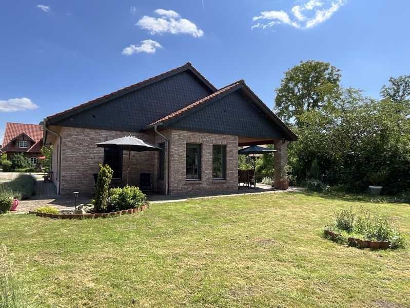 Dieser barrierefreie Bungalow mit 129 m² Wohnfläche, verteilt auf 3 Zimmer, wurde 2014 errichtet. Das Haus liegt auf einem circa 900 m² großen Grundstück, verfügt über einen Carport, ein großes Badezimmer mit ebenerdiger Dusche (Einbau einer Sauna möglich), einen großzügigen Wohn- und Essbereich (56 m²) mit offener Küche (Einbauküche inklusive) und einem Ausgang auf die Terrasse und in den Garten.