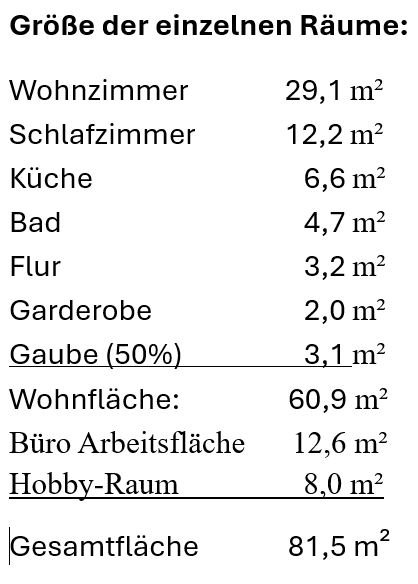 - 61 m² Wohnfläche + 12 m² Büro + 8 m² Hobbyraum + 15m² Fahrrad/Waschraum