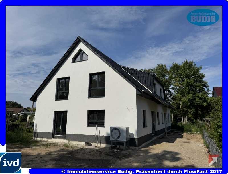 Auf dem insgesamt 818 m² großen Grundstück in ruhiger Wohnlage entsteht ein modernes Doppelhaus. Die Ansicht des Hauses wird durch Dachgauben, großzügige Fenster und eine attraktive Fassadenfarbe sehr geschmackvoll und zur Wohnumgebung passend gestaltet. Das hintere Grundstück wird nach erfolgter Teilung über eine Größe von ca. 385 m² verfügen. An der rechten Grundstücksseite des vorderen Grundstücks sichert auf einer Breite von 3 Metern ein Geh-, Fahr- und Leitungsrecht die Erschließung und Erreichbarkeit des hinteren Grundstücks. Das Wohnhaus wurde in massiver Bauweise- Stein auf Stein- errichtet. Haustechnik und Wärmeschutz gewährleisten einen hohen Wohnkomfort und niedrige heizkosten. Die gut durchdachten Grundrisse bieten auf zwei Etagen ausreichend Platz für eine Familie. Die vordere Doppelhaushälfte hat eine Wohn-/ Nutzfläche von ca. 148 m². Vom großzügigen Flur gelangt man in das helle Wohnzimmer mit einer Größe von ca. 30 m². Zwei doppelflügelige Terrassentüren lassen viel Tageslicht herein und ermöglichen den Zugang zur Sonnenterrasse und in den Garten. An das Wohnzimmer schließt die offen gestaltete, geräumige Küche an, die zusätzlich über einen Zugang vom Flur verfügt. Hier kann ein gemütlicher Essplatz für die ganze Familie eingerichtet werden. Ein Hauswirtschaftsraum und ein Gäste-WC vervollständigen das Erdgeschoss. Im Obergechoss befinden sich drei helle, gut geschnittene Zimmer und das Familienbad mit ebenerdiger Dusche und Badewanne. Der Spitzboden ist ausgebaut und sehr gut als Hobby- oder Arbeitszimmer geeignet. Die über Eck angelegte, nach Süden und Südwesten ausgerichtete Terrasse bietet einen schönen Blick über den eigenen Garten. Auf dem Grundstück werden zwei PKW- Stellplätze errichtet. Die Außenanlagen werden vorbereitet, so dass die eigenen Ideen zur Gartengestaltung schnell umgesetzt werden können..