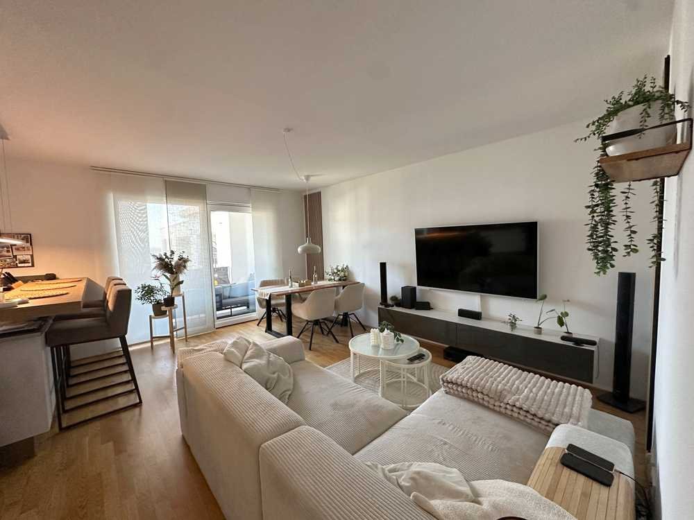 Das Herzstück der Wohnung ist der ca. 35 m² große Wohn- und Essbereich mit offener Küche sowie dem Austritt auf die nach Norden ausgerichtete Loggia mit 12 m². Das absolute Highlight ist die hochwertige Einbauküche mit Kochinsel und Theke. Die helle Einbauküche wurde mit hochwertigen Elektrogeräten ausgestattet.