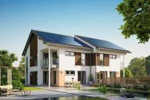 Das ist unser Doppelhaus . Hier sind in den jeweils knapp 80 qm großen Erdgeschossen die Übergänge fließend - und sorgen auf diese Weise für ein außergewöhnliches Wohn- erlebnis. Das zentral gelegene Treppenhaus trennt Eingangs- bereiche beziehungsweise Nutzräume mit HWR und Gäste-WC von dem hellen Wohn-Koch-Ess-Bereich, der mit seiner Größe von mehr als 45 qm den Mittelpunkt des Hauses bildet. Im Obergeschoss: ein Elternschlafzimmer mit inte- grierter Ankleide, zwei Kinderzimmer sowie ein Badezimmer mit Wanne, Dusche und WC.