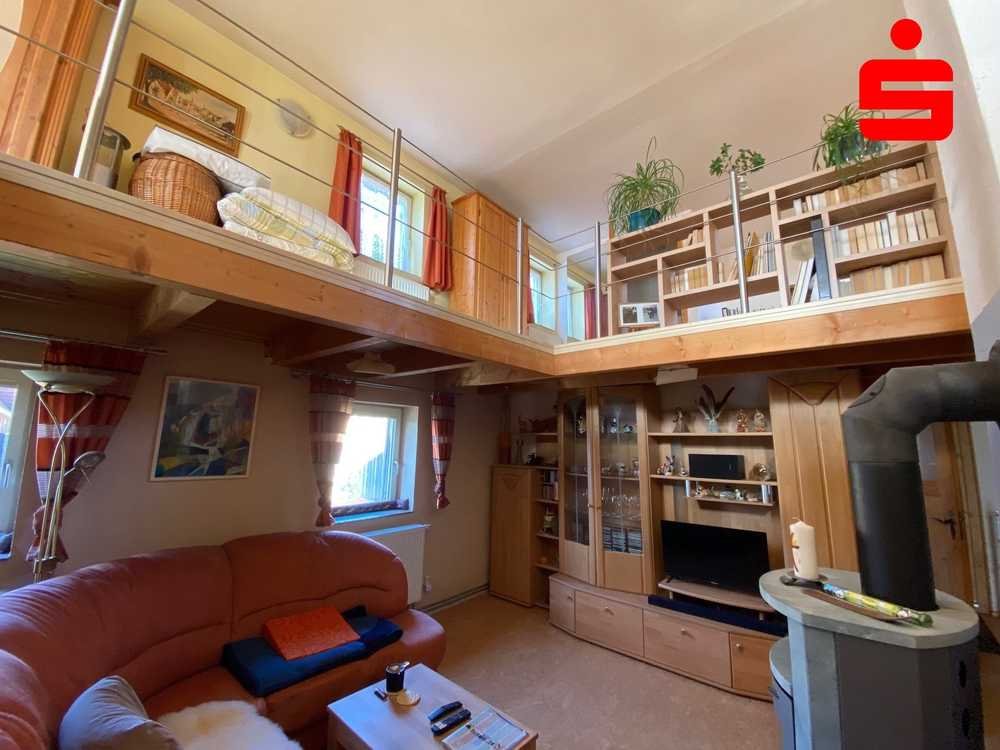 Im Obergeschoss gelangen Sie in die Wohnung, die erst 2010 ausgebaut wurde und vor allem durch ihre einzigartige Bauweise mit offener Galerie im Atrium-Stil beeindruckt. Auf der ersten Ebene empfängt Sie ein offener Wohn-/Essbereich mit moderner Einbauküche und gemütlichem Kaminofen. Das Schlafzimmer bietet ausreichend Platz und wird über eine Natursteinplatte beheizt. Hier hat man Zugang zum Balkon mit Südausrichtung. Das Badezimmer ist zeitlos eingerichtet und verfügt über eine Whirlwanne und eine Dusche.