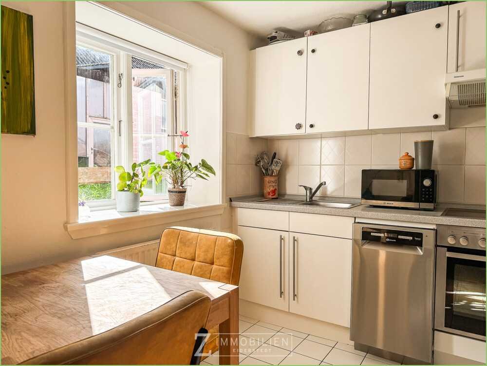 Im Erdgeschoss erwarten Sie ein Flur, eine Küche mit Einbauküche, ein modernes Duschbad sowie ein gemütlicher Wohn- und Essbereich. Ein Abstellraum unter der Treppe bietet zusätzlichen Stauraum. Über eine Steintreppe gelangen Sie ins Dachgeschoss mit zwei hellen Schlafzimmern.