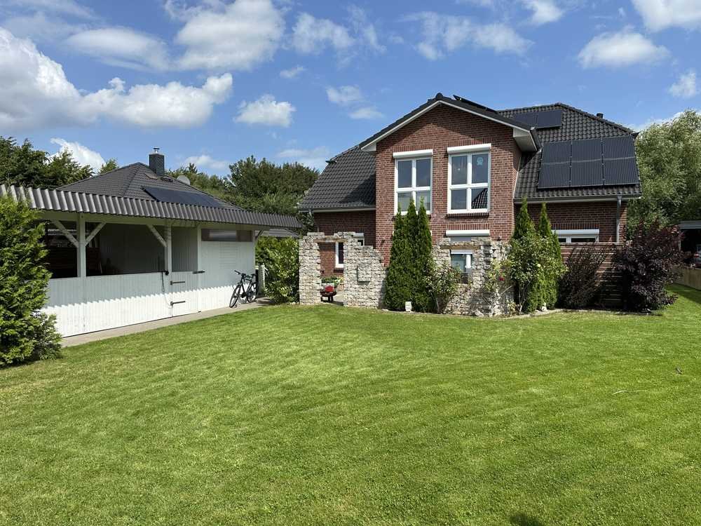 Die Immobilie ist von der Straße etwas nach hinten abgesetzt und durch das Carport sowie die Bepflanzung optisch entsprechend abgegrenzt. Der Hauseingang ist seitlich angeordnet. Ein geräumiger Flur mit Treppenaufgang verbindet im Erdgeschoss alle Räume miteinander. Hervorzuheben ist insbesondere der offene Wohn- und Essbereich inkl. Wohnküche mit einer Gesamtgröße von ca. 58m². Die Küche hat einen praktischen Nebenraum für Vorräte, Putzmittel usw.. Zudem gelangen Sie von der Küche aus auf die Ost-Terrasse, auf der Sie Ihr Frühstück und den Morgenkaffee genießen können. Von dem Wohn-/Essbereich aus gelangen Sie auf die großzügige Terrasse, welche nach Südwesten ausgerichtet ist und somit fast ganztägig Sonne bietet. Außerdem befinden sich im Erdgeschoss ein Gästezimmer/Büro, ein Gäste-WC mit Dusche und der Hauswirtschaftsraum. Im Obergeschoss stehen drei (Schlaf-)Zimmer - davon eins mit zusätzlichem Ankleideraum, ein Vollbad und ein Abstellraum zur Verfügung. Den Dachboden als Stauraum erreichen Sie über eine Ausziehleiter im Flur.