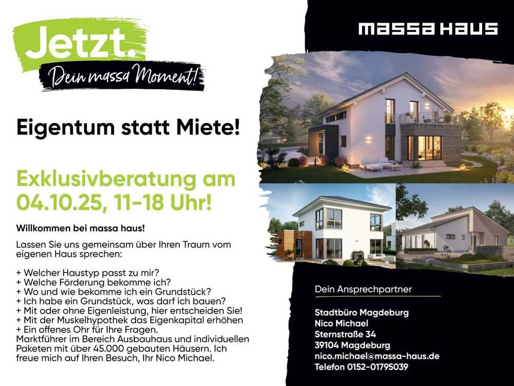 Nutzen Sie auch die unglaubliche Aktion von massa Haus, ich erstelle Ihr persönliches Hauskonzept und freue mich auf Ihren Besuch.