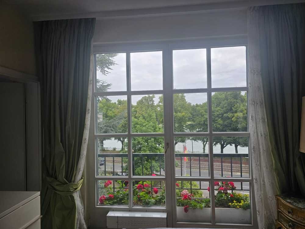 Diese exklusive Wohnung liegt direkt am Rhein und bietet einen traumhaften Blick auf den Fluss sowie einen idyllischen Garten mit Schwimmbad, der an einen Wald erinnert.