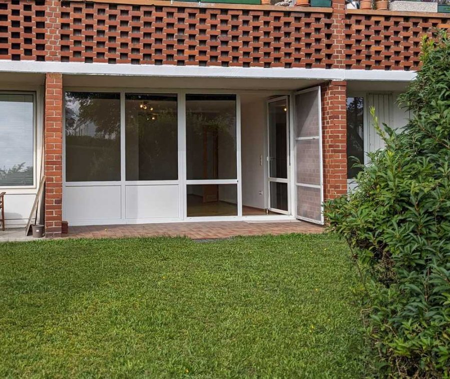 Das gut geschnittene Apartment in einem 12-Parteienhaus wirkt durch seine große Fensterwand hell und freundlich und bietet sogleich einen schönen Blick auf den Gemeinschaftsgarten. Eine Hecke sorgt für Privatsphäre und schirmt von der Straße ab.