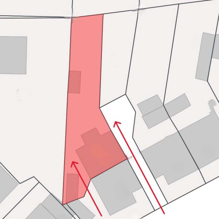 Bei diesem Doppelhaus orientiert sich eine Seite Richtung Straße ( Sackgasse ) und die angebotene Hälfte in zweiter Reihe. Das Grundstück erschließt sich über die rückseitige Durchfahrt, wo sich Hauseingang, Garage und der großzügige Garten befinden.