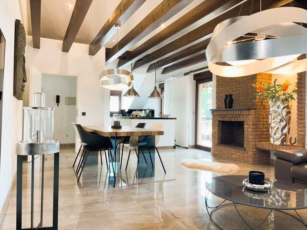 Besonderes Highlight ist die beeindruckende Deckenhöhe mit sichtbaren Holzbalken sowie ein stilvoller offener Kamin, der dem Wohnbereich eine warme, einladende Atmosphäre verleiht.