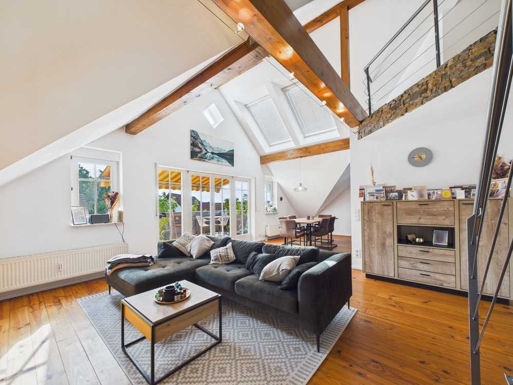 Die Wohnung bietet auf der unteren Etage einen geräumigen Wohn-, Ess- und Küchenbereich (inkl. Vorratsraum) mit Balkon (inkl. Markise), ein separates Zimmer (Kinder-, Gäste- oder Arbeitszimmer) und das renovierte Badezimmer mit Waschmaschinenanschluss, Eckbadewanne und bodenebener Dusche. Auf der oberen Etage befindet sich das große Schlafzimmer und eine offene Galerie.