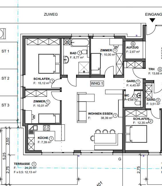 Küche, ein Schlafraum, zwei Arbeits-/Kinderzimmer, eine Gästetoilette, ein Tageslichtbad mit bodenebener Dusche und Badewanne und einen Abstellraum.