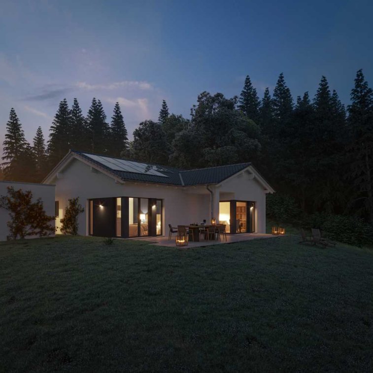 Unser voll unterkellerter Bungalow AMBIENCE 77 KG bietet durch die zahlreichen, bodentiefen Fensterelemente nicht nur lichtdurchflutete Räumlichkeiten, sondern dadurch auch ein einmaliges Wohngefühl. Eine große Wohn-Küche, sowie ein offener Wohn-Essbereich sind der ideale Treff- und Lebensmittelpunkt für Ihre Familie und Freunde.