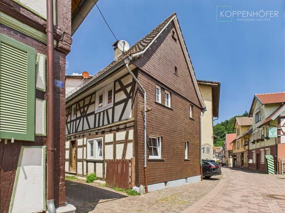 Das erste Haus ist ein Fachwerkjuwel mit ca. 71 m² Wohnfläche und zusätzlich ca. 50,5 m² Nutzfläche. Massive Echtholztüren – teils als Schiebetüren ausgeführt – und sichtbares Gebälk prägen den einzigartigen Charakter.
