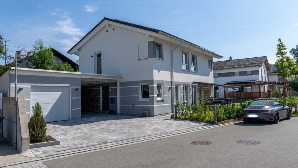 Ihnen steht außerdem eine Garage mit elektrischem Tor über Funkfernbedienung und ein Carport für Ihre Fahrzeuge zur Verfügung. Somit ist stets ein trockenes und beschattetes Be- und Entladen der Fahrzeuge über den überdachten Eingangsbereich in das Haus gegeben.