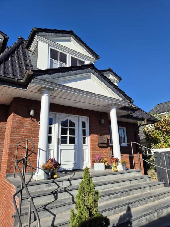 Unser Mansarddachhaus mit einer Wohn- Nutzfläche von 260 qm und überdachter 60qm Terrasse steht auf einem 1.088qm großen Grundstück in einer ruhigen, gepflegten Seitenstraße mit überwiegender Einzelhausbebauung , der unverbaubare Blick in die Natur mit morgentlichem Besuch von Fasan, Hase und Co. ist garantiert.