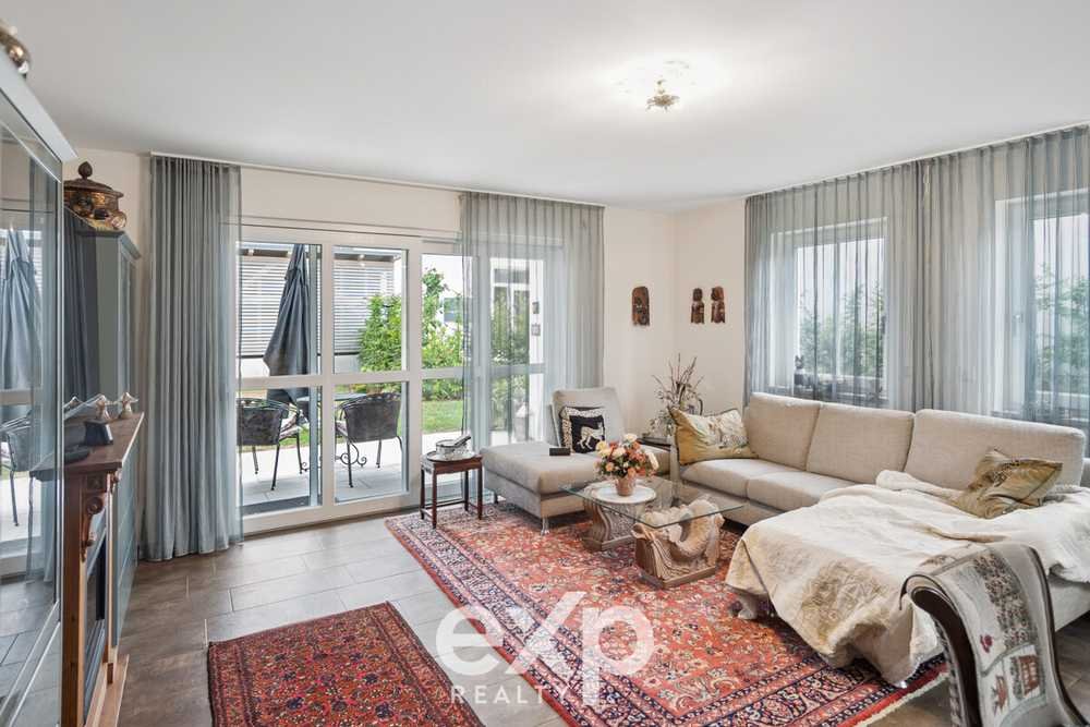 Das Herzstück der Wohnung ist der offene Wohn-Ess-Bereich mit moderner, heller Küche. Von hier gelangen Sie direkt auf die überdachte Terrasse mit kleinem Gartenanteil – ein echtes Highlight für entspannte Stunden im Freien.