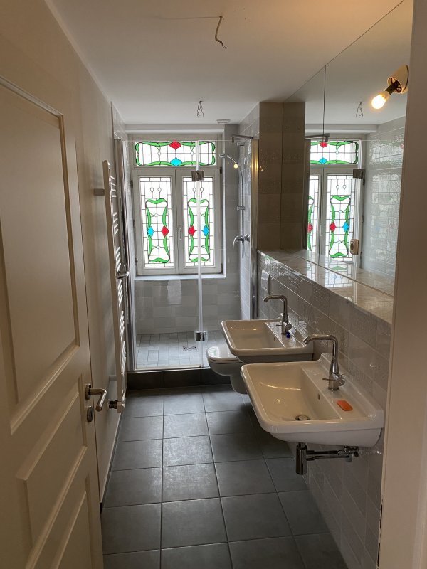 Im ersten Obergeschoss befinden sich zwei helle Wohn- /Schlafräume zusammen 33 m2 sowie ein Bad mit zwei Waschtischen und Dusche.