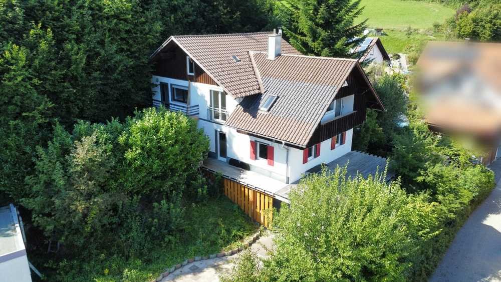 Das Einfamilienhaus in Böhen liegt idyllisch am Hang und fügt sich harmonisch in die grüne Umgebung ein. Das großzügige Grundstück ist durch zahlreiche Bäume und Pflanzen perfekt abgeschirmt und bietet ein hohes Maß an Privatsphäre. Über die Hofeinfahrt gelangt man direkt zur Garage, von wo aus ein Zugang in den Keller und ins Haus führt. Besonders einladend ist der freie Blick ins Grüne, den man sowohl vom Balkon als auch von den verschiedenen Terrassen auf unterschiedlichen Etagen genießen kann. Durch die untere Terrasse bestünde zudem die Möglichkeit, weitere Stellplätze zu schaffen.