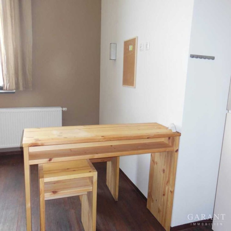 Die gut ausgestattete Küche verfügt über einen Küchentisch, der ausreichend Platz für gemütliche Mahlzeiten bietet. Der Wohnbereich ist mit einem Schreibtisch ausgestattet, der sich perfekt für Homeoffice oder kreative Tätigkeiten eignet. Ein komfortables Bett sorgt für erholsame Nächte. Eine praktische Abstellkammer mit Regalsystem bietet zusätzlichen Stauraum und hilft, Ordnung zu halten. Das Badezimmer ist sehr geräumig und mit einer Dusche ausgestattet, die für zusätzlichen Komfort sorgt. Im Gebäude befindet sich ein Wasch- und Trockenraum. Hier können Sie mit Münzen sowohl Wäsche waschen als auch trocknen. Ebenso befindet sich ein Fahrradkeller im Gebäude. So steht Ihr Rad in einem abschließbaren Bereich.