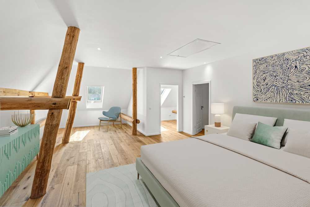 Für den Umbau dieser denkmalgeschützten Speicheranlage zu einem exklusiven Wohnhaus wurden sämtliche Decken und Fachwerkbalken aufgearbeitet und in den Wohnraum integriert. Von der Betonsohle über die Außenwände bis hin zum Dachziegel ist alles neu verbaut.