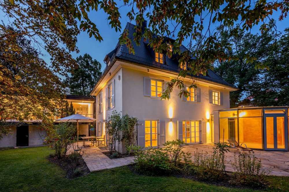 Eingebettet in ein idyllisch eingewachsenes Gartengrundstück mit parkähnlichem Charakter fasziniert dieses besonders reizvolle Domizil mit äußerst großzügigen, perfekt gegliederten Räumlichkeiten, die sich über ca. 387 m² erstrecken und auf drei Ebenen verteilen. Die klassische Fassade der Villa aus dem Jahr 1938/39 strahlt mit weißen Holzsprossenfenstern und blaugrauen Klappläden historischen Charme aus. Ahornparkett mit Fußbodenheizung, Natursteinbäder, maßgeschreinerte Einbauten und ein Kamin unterstreichen die Wertigkeit und lassen ein ebenso repräsentatives wie komfortables Wohnumfeld entstehen.