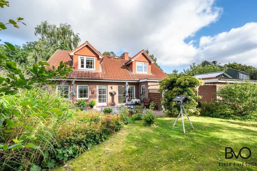 Das etwa 1.067 m² große Grundstück besticht durch seine idyllische Feldrandlage und die Einbettung in die Natur. Ein kleiner Teich, schützende Hecken und viel Grün schaffen eine besonders gemütliche Wohlfühloase. Eine breite Grundstückszufahrt führt zum Eingangsbereich des Hauses und zum Doppelcarport, während ein angrenzender massiver Anbau als Werkstatt oder Unterstand für Gartengeräte genutzt werden kann. Ein kleines Holzhaus rundet das stimmige Gesamtbild des Außenbereichs ab.