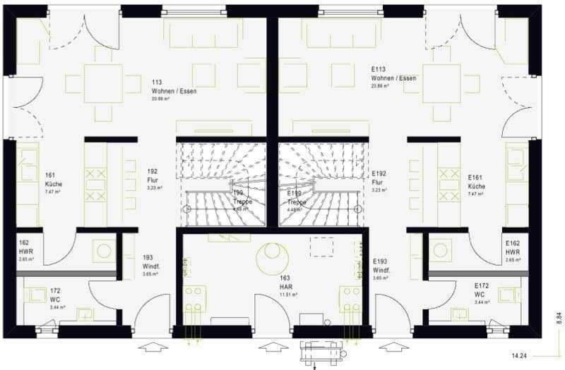 Das Doppelhaus beeindruckt mit seiner Wohngrundfläche von ca. 125 m² und lässt eine geschickte Raumaufteilung für die Verwirklichung individueller Wünsche zu. Im Erdgeschoss wurde der Wohn- und Essbereich und die Küche gekonnt miteinander verbunden. Im Obergeschoss unter dem Satteldach befinden sich ein Elternschlafzimmer, zwei Kinderzimmer sowie ein gemeinsames Badezimmer.