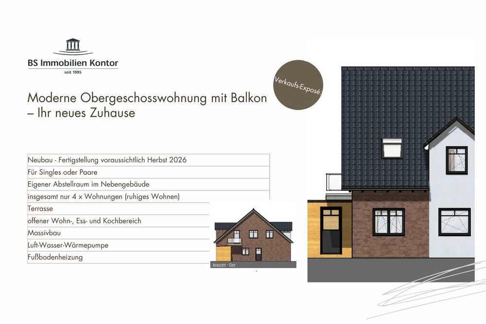 Diese moderne Dachgeschosswohnung besticht durch ihre helle und freundliche Gestaltung. Im Mittelpunkt steht der großzügige Wohn-, Ess- und Kochbereich mit direktem Zugang zum Balkon – ideal für entspannte Stunden im Freien. Ein geräumiges Schlafzimmer bietet viel Platz zum Erholen, während ein weiteres Zimmer flexibel als Kinder-, Gäste- oder Arbeitszimmer genutzt werden kann. Das moderne Badezimmer ist mit einer ebenerdigen Dusche ausgestattet. Praktisch ergänzt wird die Wohnung durch einen separaten Hauswirtschaftsraum. Das Haus überzeugt durch hochwertige Bauweise und Ausstattung: Es wird in massiver Bauweise errichtet und verbindet zeitgemäße Architektur mit moderner Technik. Außenwände aus Y-tong Porenbeton mit Wärmedämmung und Verblendmauerwerk. Dreifach verglaste Kunststofffenster mit elektrischen Rollläden, eine effiziente Luft-Wasser-Wärmepumpe von Vaillant sowie Fußbodenheizung garantieren hohen Komfort und Energieeffizienz. Die Wohnung wird mit pflegeleichtem Klickvinyl ausgestattet, Bad und Hauswirtschaftsraum sind gefliest. Das Badezimmer verfügt über eine bodengleiche Dusche mit Duschkabine und WC. Die Elektroinstallation umfasst unter anderem auch ausreichend Netzwerk- und Antennenanschlüsse. Der Balkon wird mit Feinsteinzeugplatten belegt und mit einem modernen Edelstahl-Glas-Geländer eingefasst. Ein eigener Abstellraum im Nebengebäude bietet zusätzlichen Stauraum.