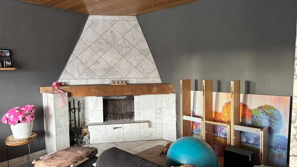 - Wohnzimmer mit Kamin und direktem Zugang zum Balkon