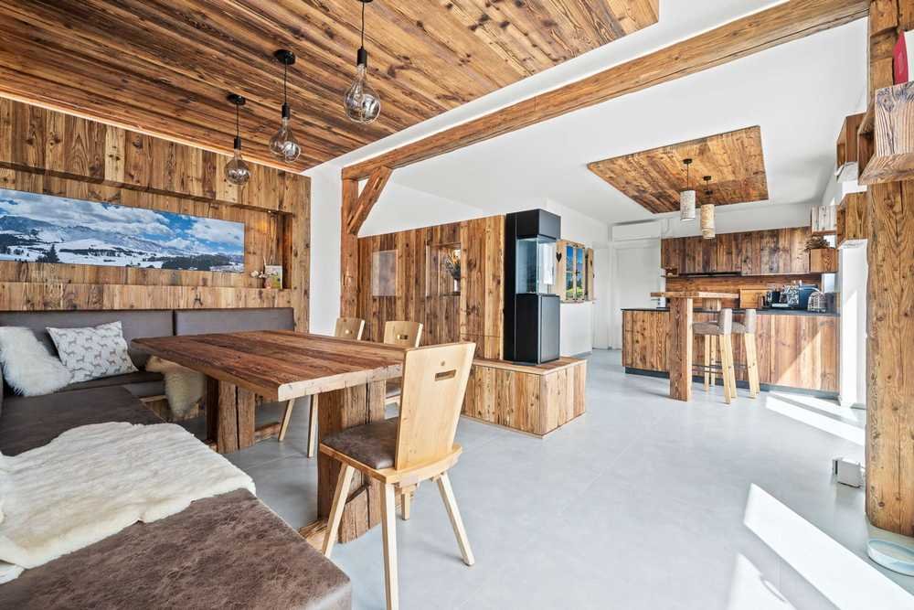 Die gemütliche Essecke aus edlem Holz und ein stilvoller Ethanol-Ofen verleihen dem Raum Wärme und Behaglichkeit, während dezente, indirekte Beleuchtung die elegante Ausstattung harmonisch in Szene setzt und eine einladende Atmosphäre schafft.